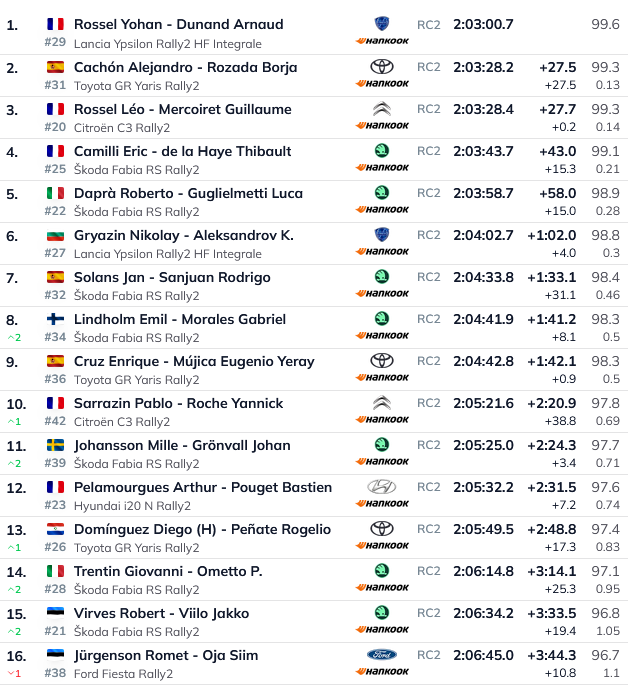 Rally2 arvestuses hoiavad eestlastest laupäeva järel parimat kohta Robert Virves / Jakko Viole (Škoda), kes jäävad 14 kiiruskatse järel esikohast 3.33,5 kaugusele ja hoiavad 15. kohta. Kohe nende seljataga lõpetasid päeva Romet Jürgenson / Siim Oja (Ford), kes jäävad kaasmaalastest 10,8 sekundi kaugusele.