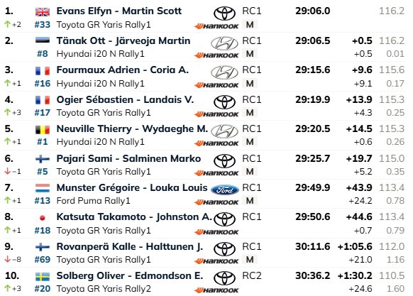 Rovanperä / Halttunen jätkasid päeva teisel katsel sealt, kus oli pooleli jäänud ja suurendasid teiseks tõusnud Tänak / Järveoja ees üldedu 5,8 sekundi peale. Katse kolmandad olid ülesõidul auto seadeid muutnud Adrien Fourmaux / Alexandre Coria (Hyundai). Üldarvestuses hoidsid prantlased 7,8 sekundilise kaotusega neljandat kohta.